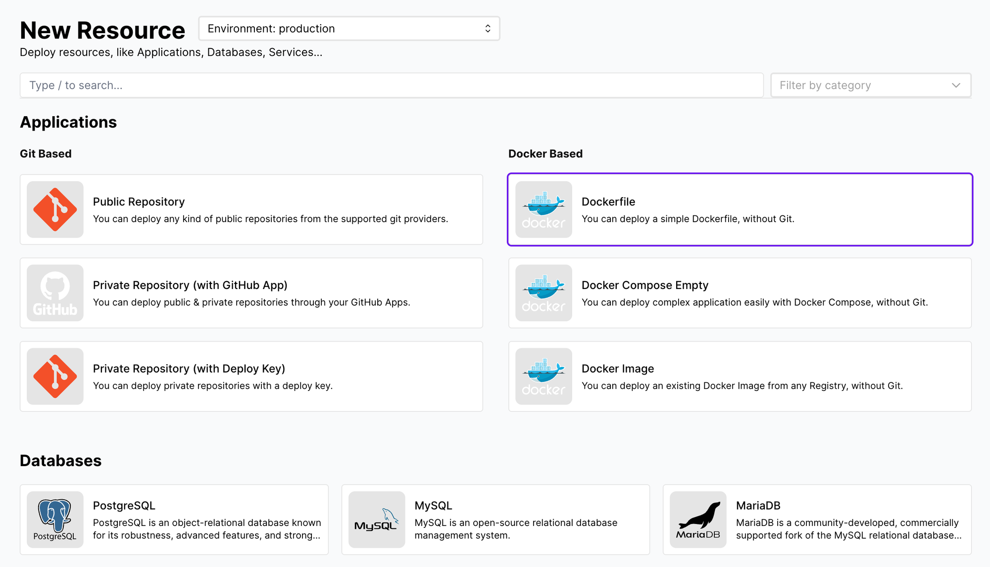 Coolify supports deploying custom applications and 3rd-party services. It generally distinguish between 3 different types of resources: