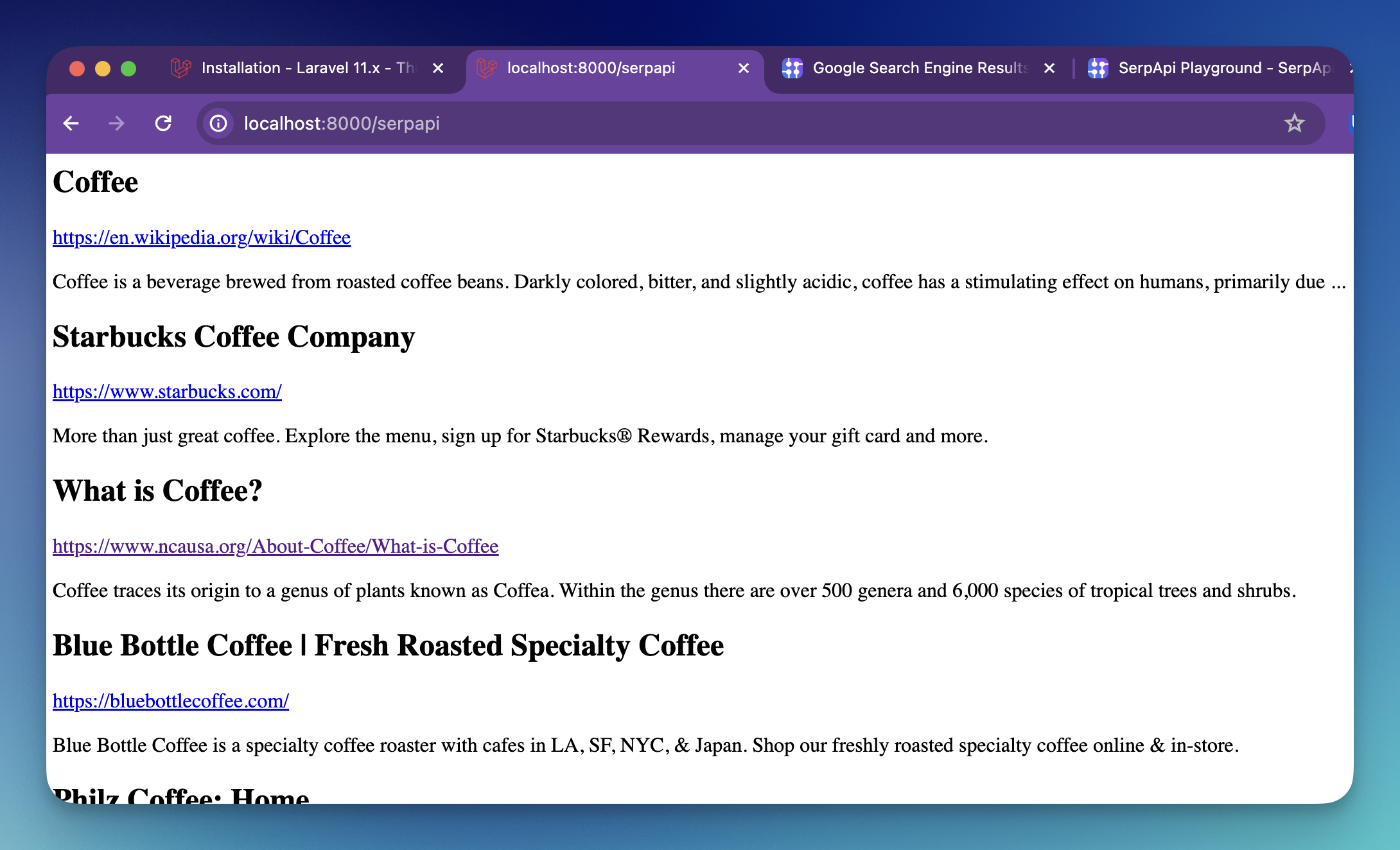 return view('serpapi', compact('organic_results'));Create new /views/serpapi.blade.php file. For example, if you want to loop the organic results: