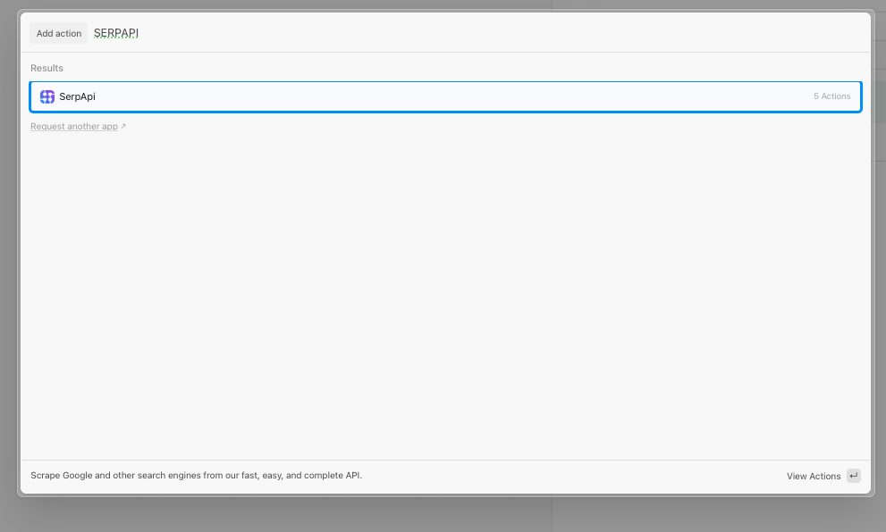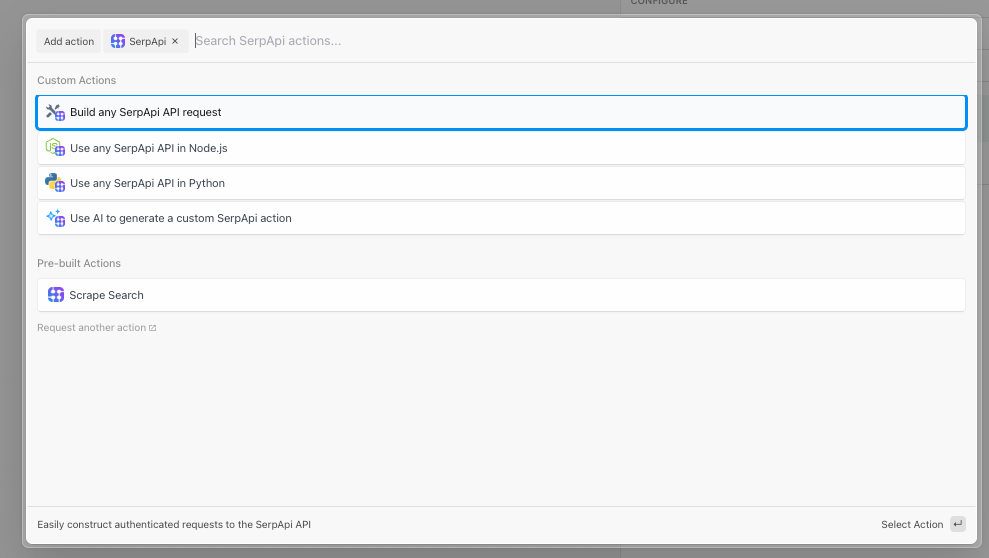 In this blog post, we'll explore the "Build any SerpApi API request" action and see how you can use this to query any of our APIs. This is what it initially looks like: