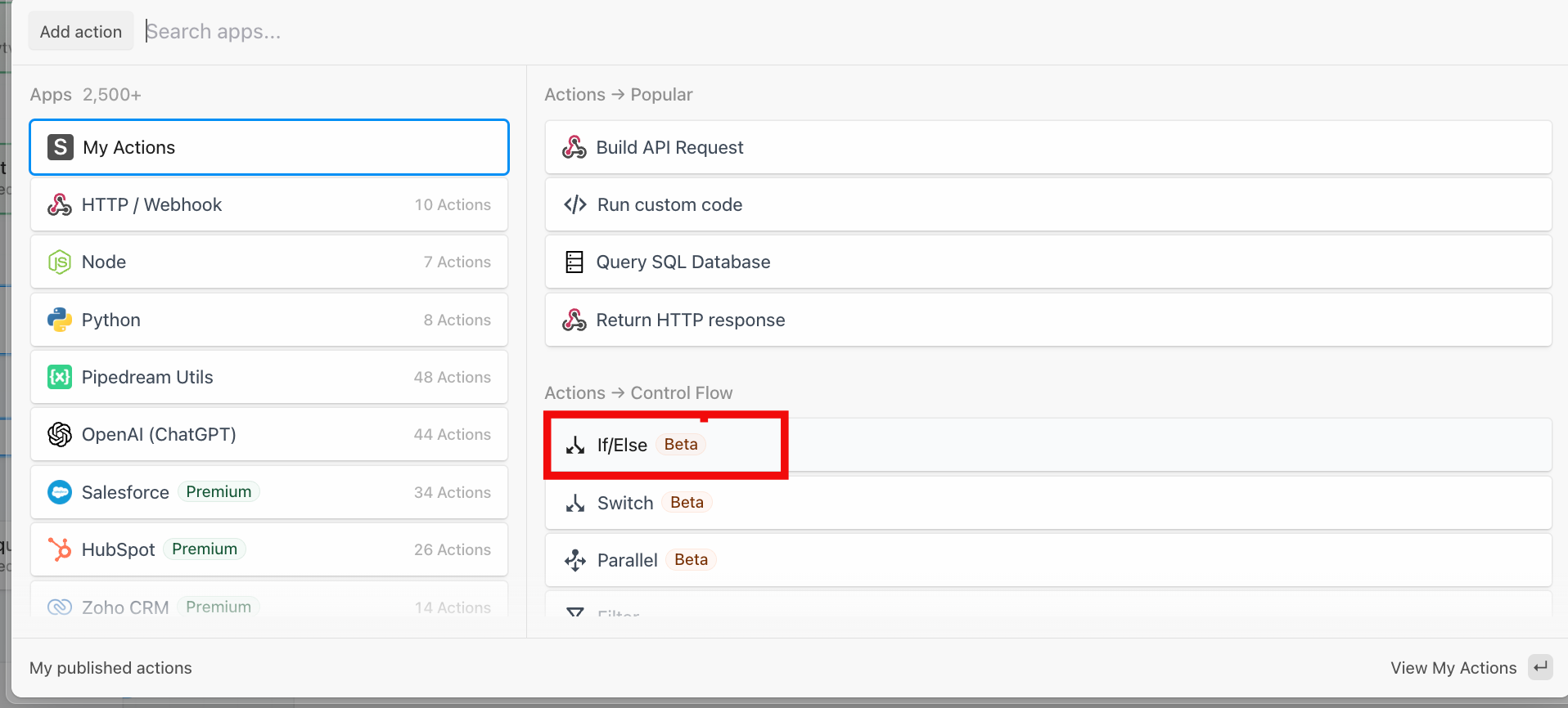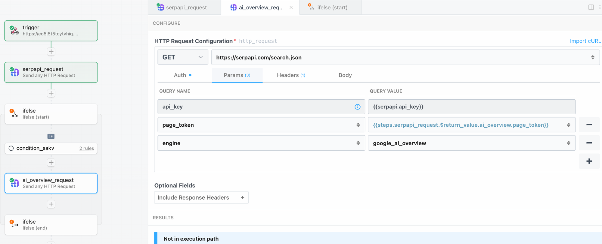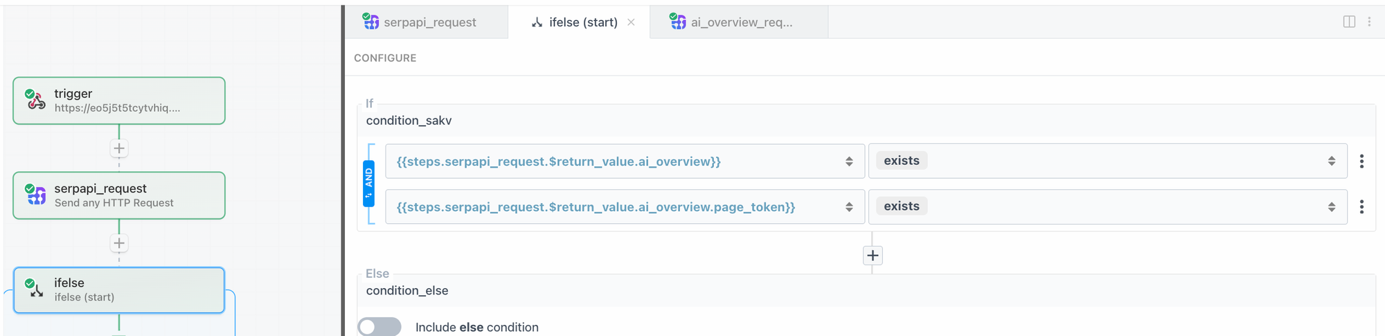 In this case, we can use an IF condition in Pipedream, since we only want to make a call to our AI overview API if we receive a page token in response from the Google Search API: