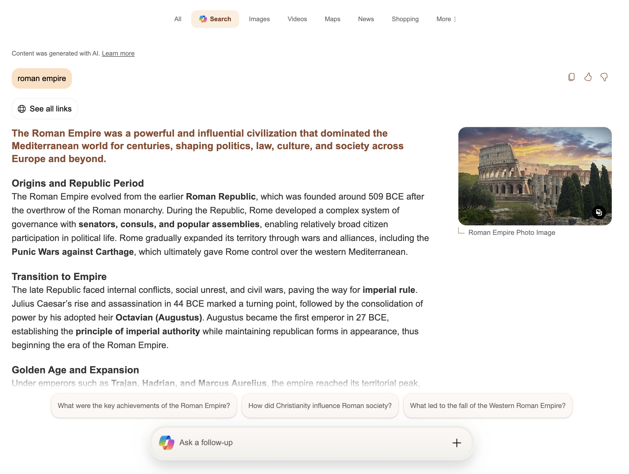 Bing Copilot’s answer to a query (here “Roman Empire”) appears as a summary card with text, an image, and a list of numbered source links.