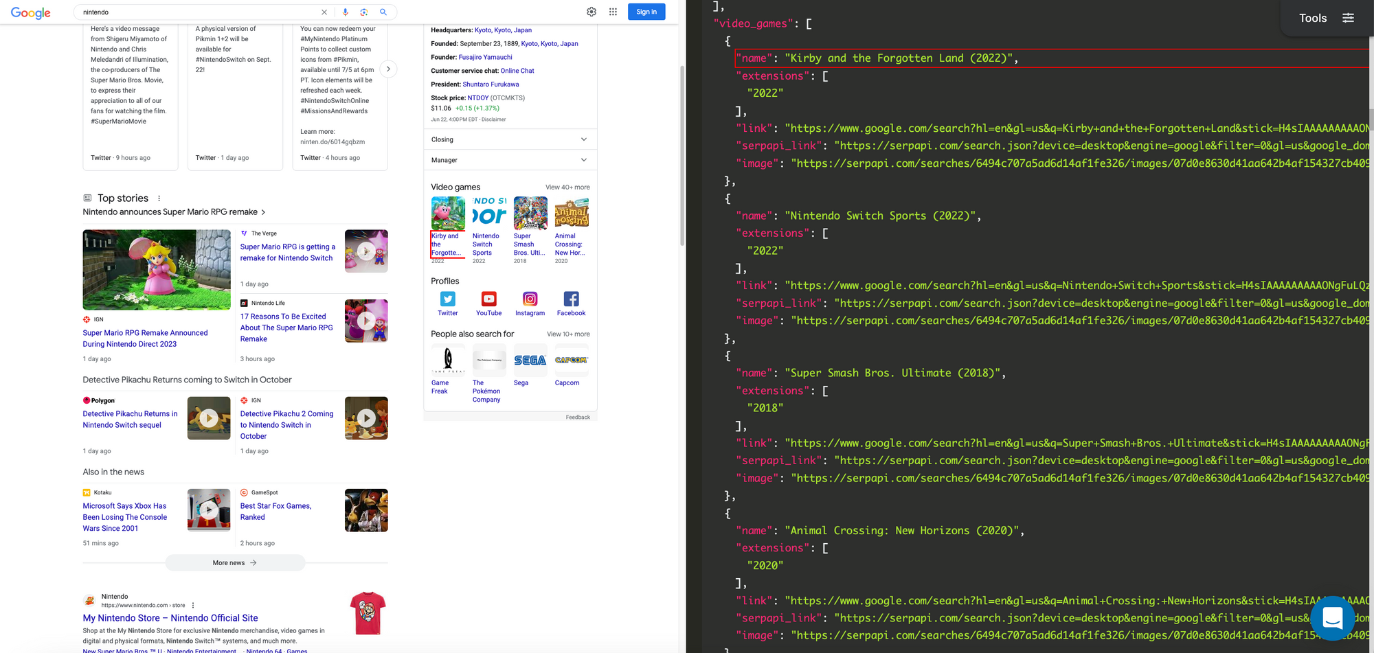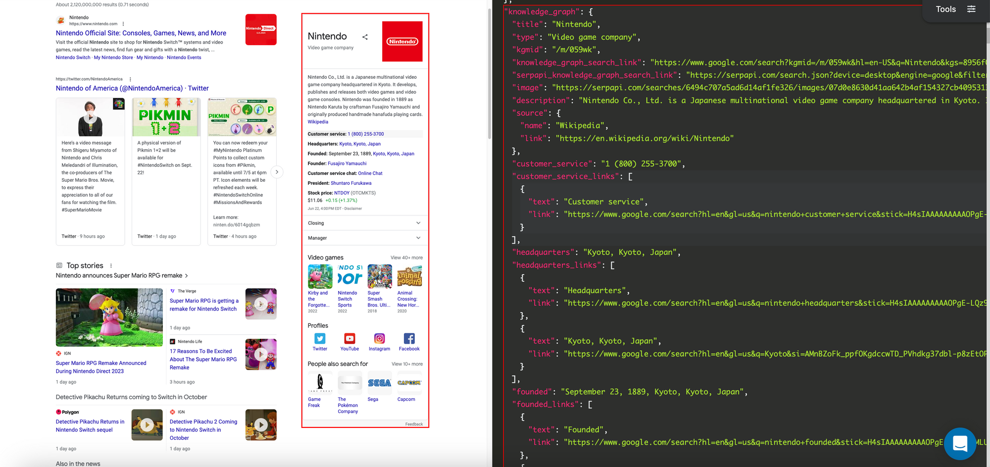 As an example, take a look at the JSON response for this SerpApi request to search Google for "Nintendo":