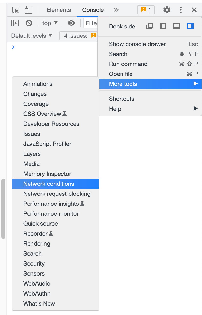 You can do this by opening the Developer Tools panel, clicking the three dots in the right corner, and selecting More tools > Network conditions.