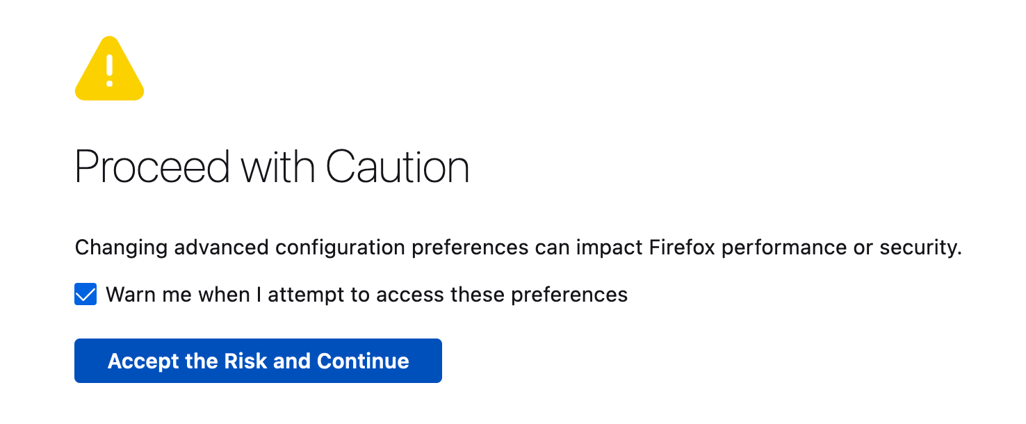 Similarly, you can do this in Firefox by entering about:config into your address bar. Click Accept Risk and Continue.