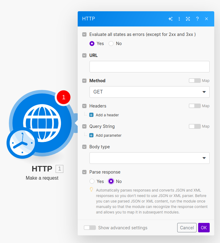 We need to manually run it once to allow Make to understand the response content. It's a good idea to run it once as a test anyway. Click the "Run once" button" in the bottom left.