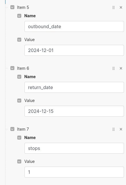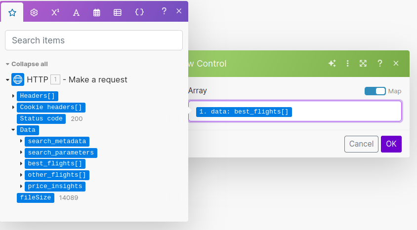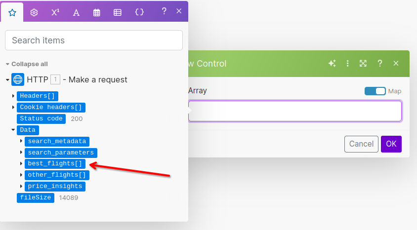 Click in the "Array" form field to get the pop up with all the response data from our API call. Click on best_flights[].