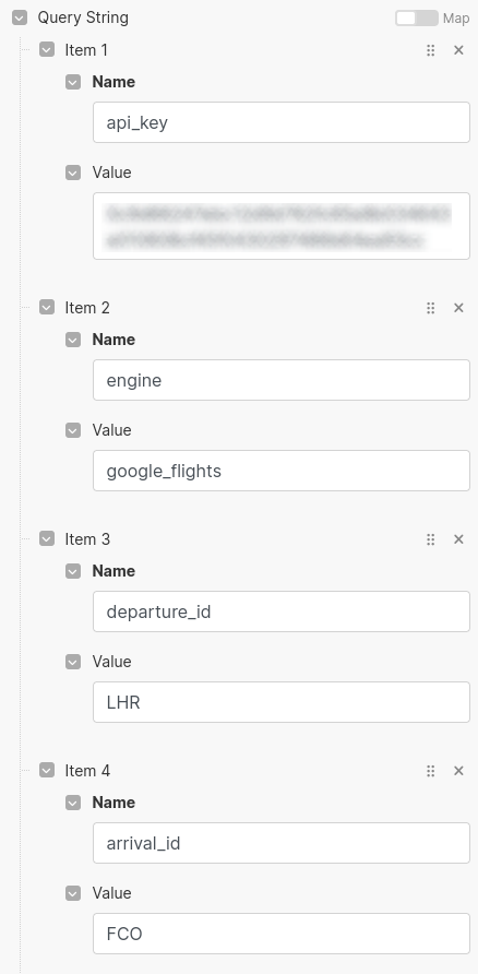 Arrival Airport: {{2.flights[].arrival_airport.name}} - {{2.flights[].arrival_airport.id}}<br />