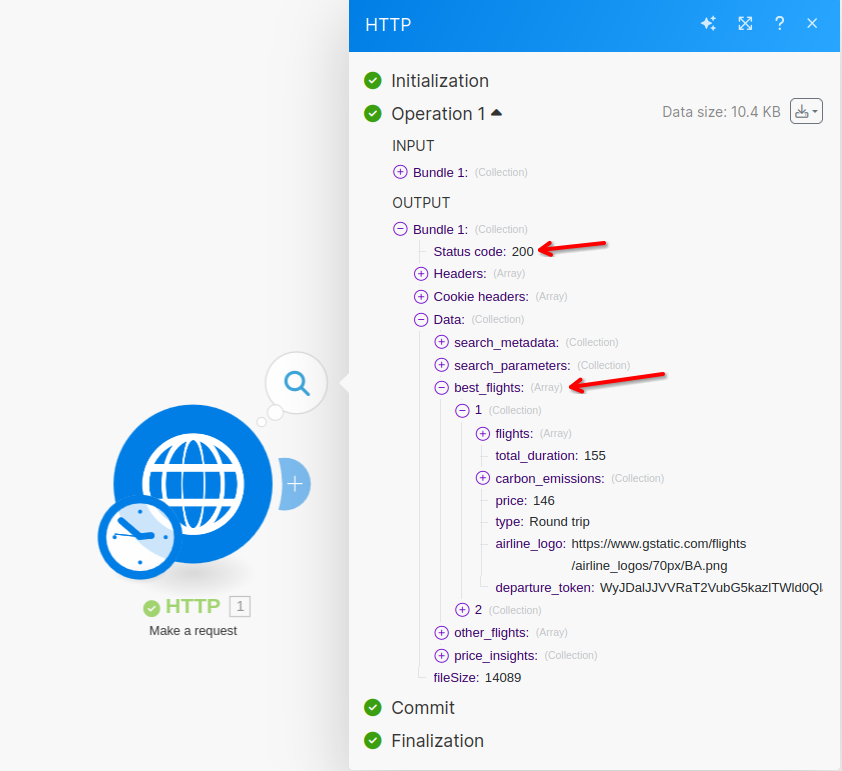 This will open the results of the last API call. Make sure the status code is 200 and there's a best_flights array present.