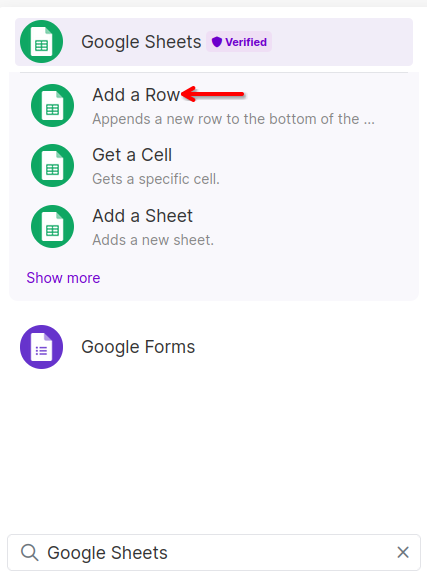 Coming back to Make.com, add another module after the Iterator and search for "Google Sheets." Select the "Add a Row" option.