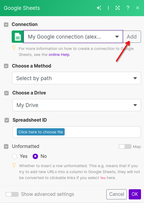 Click on the Google Sheets module in the Scenario editor to bring up the menu. Click 'Add' or select an existing connection to Google Sheets.