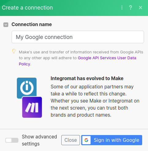 Follow the "Sign in with Google" flow and connect Google Sheets with Make.