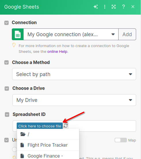 Now we'll configure our Scenario to add data to Google Sheets.