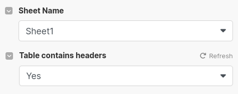 Also, select "Yes" to tell Make the table contains headers. This should auto-populate the form fields with the appropriate column header from our Google Sheet (e.g. "Search Time (A) because column A's header is Search Time). If it didn't do that, try clicking "Refresh".