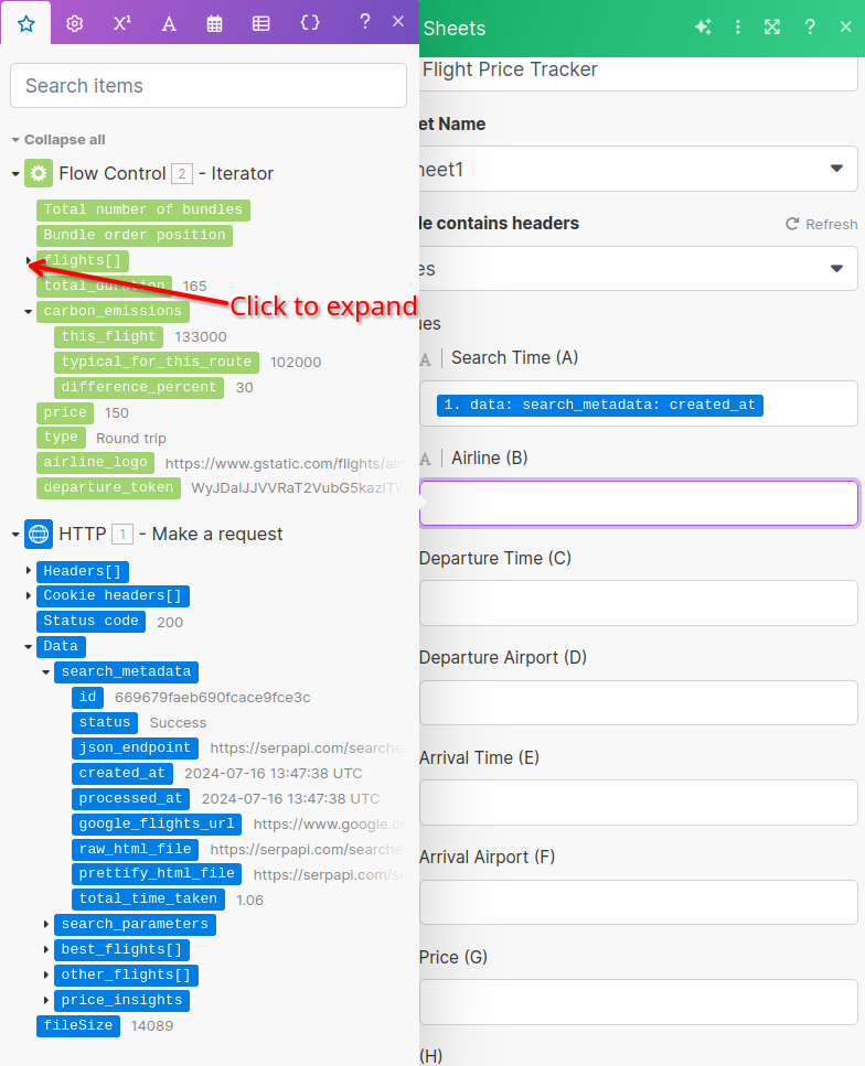 best_flights is an array so we need to tell Make to iterate through each best flight and add it to a Google Sheet. We'll do this by adding an "Iterator" module.