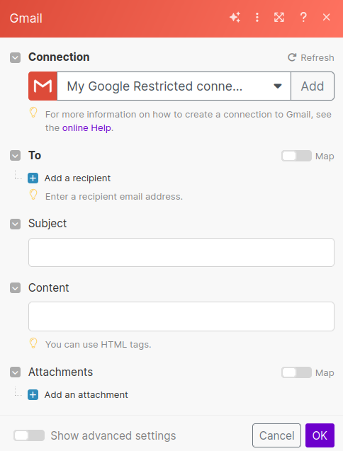 Similar to the Google Sheets connection, you'll need to add a connection to Gmail or use an existing one. Follow the Google authorization steps the same way you did for Google Sheets.
