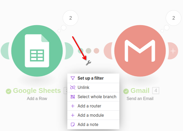 We can configure Make to conditionally send emails by clicking the wrench icon between the Google Sheets and Gmail modules. Then click "Set up a filter".