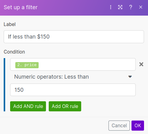 I'll set my budget for $150 by setting a condition to send an email if the price is less than 150.