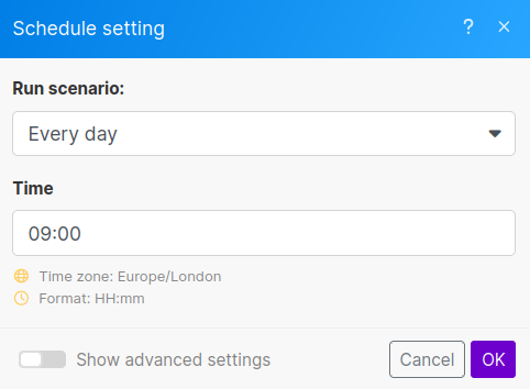 Finally, we need to set how often our search should run. By default, Make runs every 15 minutes. That's too aggressive for a flight price tracker. Instead, let's have it run once a day at 9am.