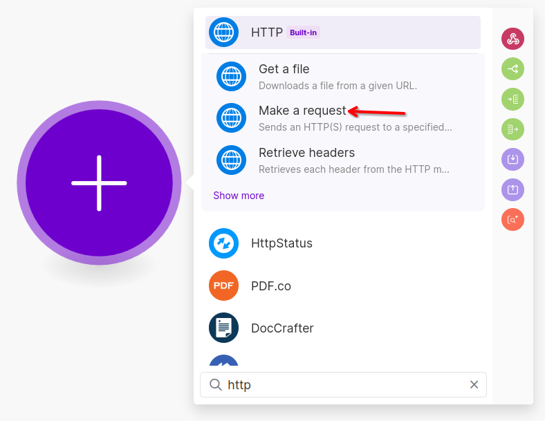 Our first step will be to make an HTTP request to our Google Flights API. We'll search for "http" and click "Make a request" within the "HTTP" module.
