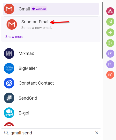 Next, we'll configure our Scenario to email us whenever it finds a flight within our budget. Add another module and search for "gmail send". Then select the "Send an Email" option under Gmail.