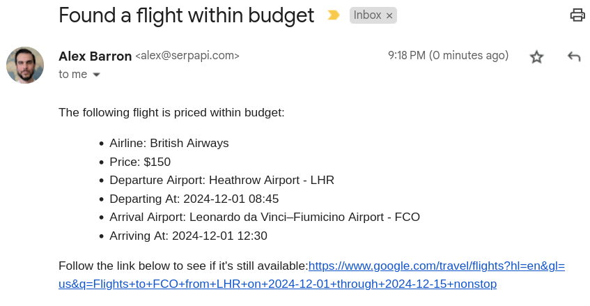If all went well, we should have an email notification in our inbox for each best flight Google Flights found.