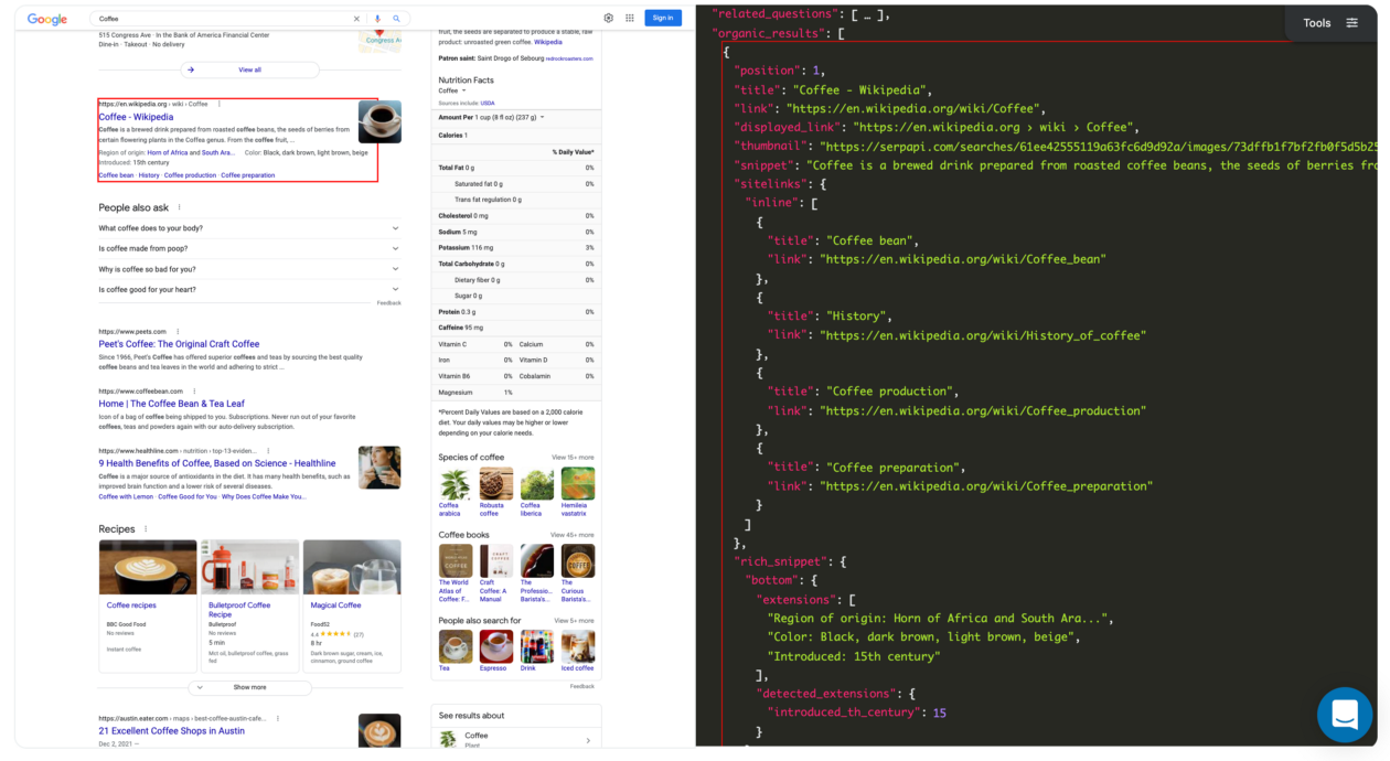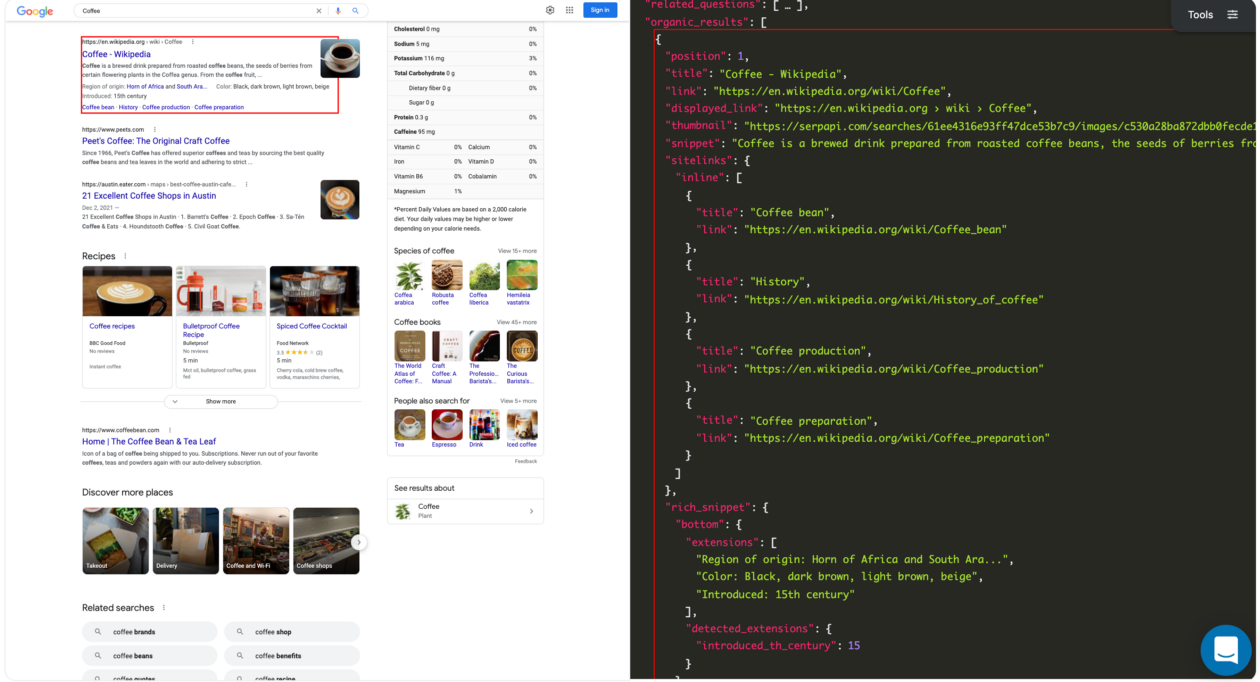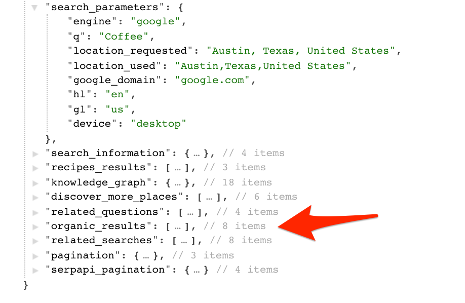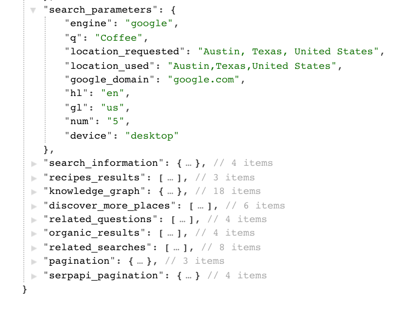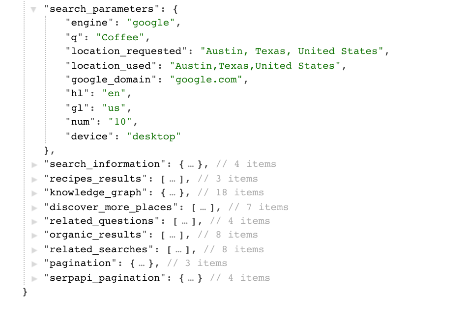 Now while the organic_results only provided 8 items, there is a wide set of results, recipes_results, knowledge_graph, discover_more_places related_searches .