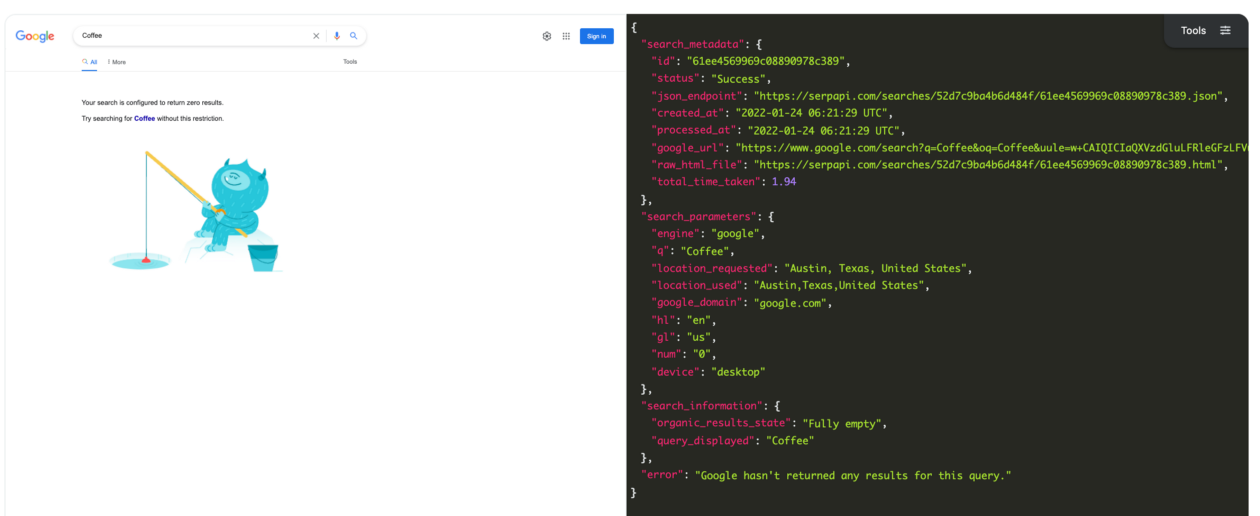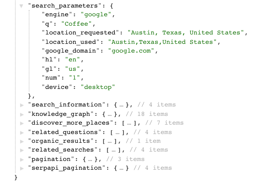 First, the control group with SerpApi’s classic “Coffee” search engine in Austin, Texas…this time with the num parameter omitted:
