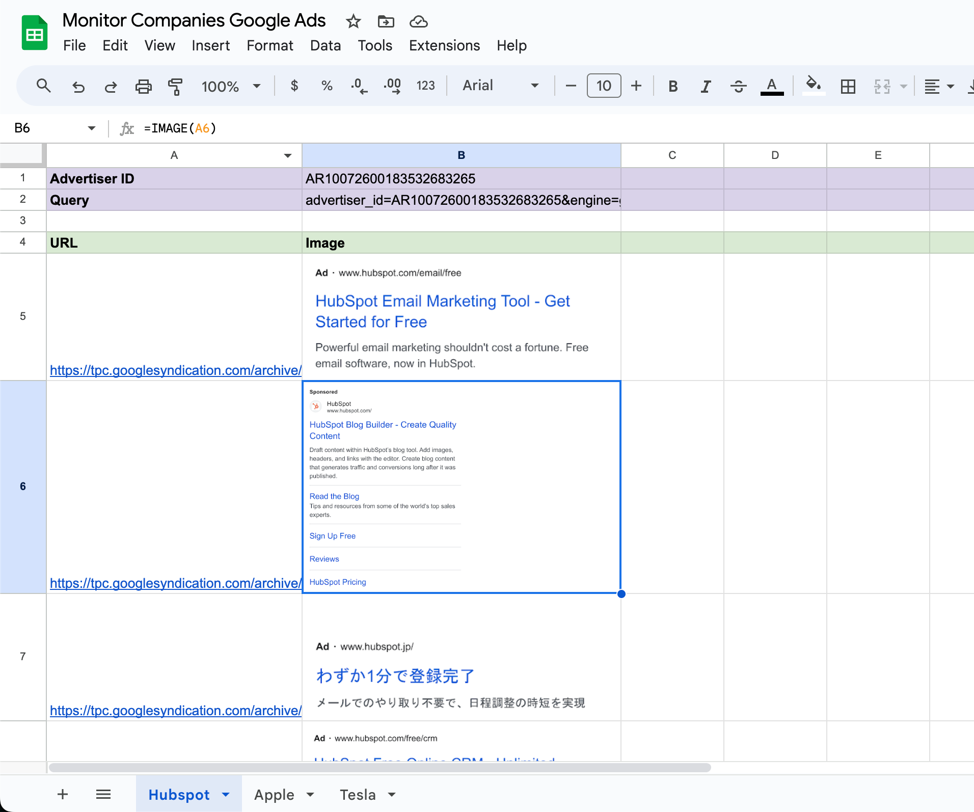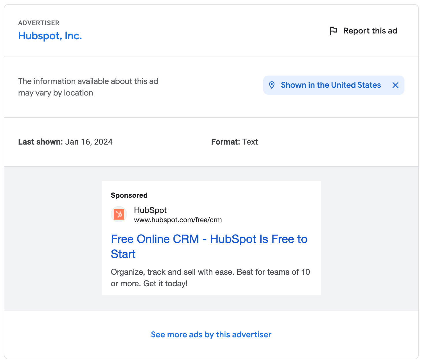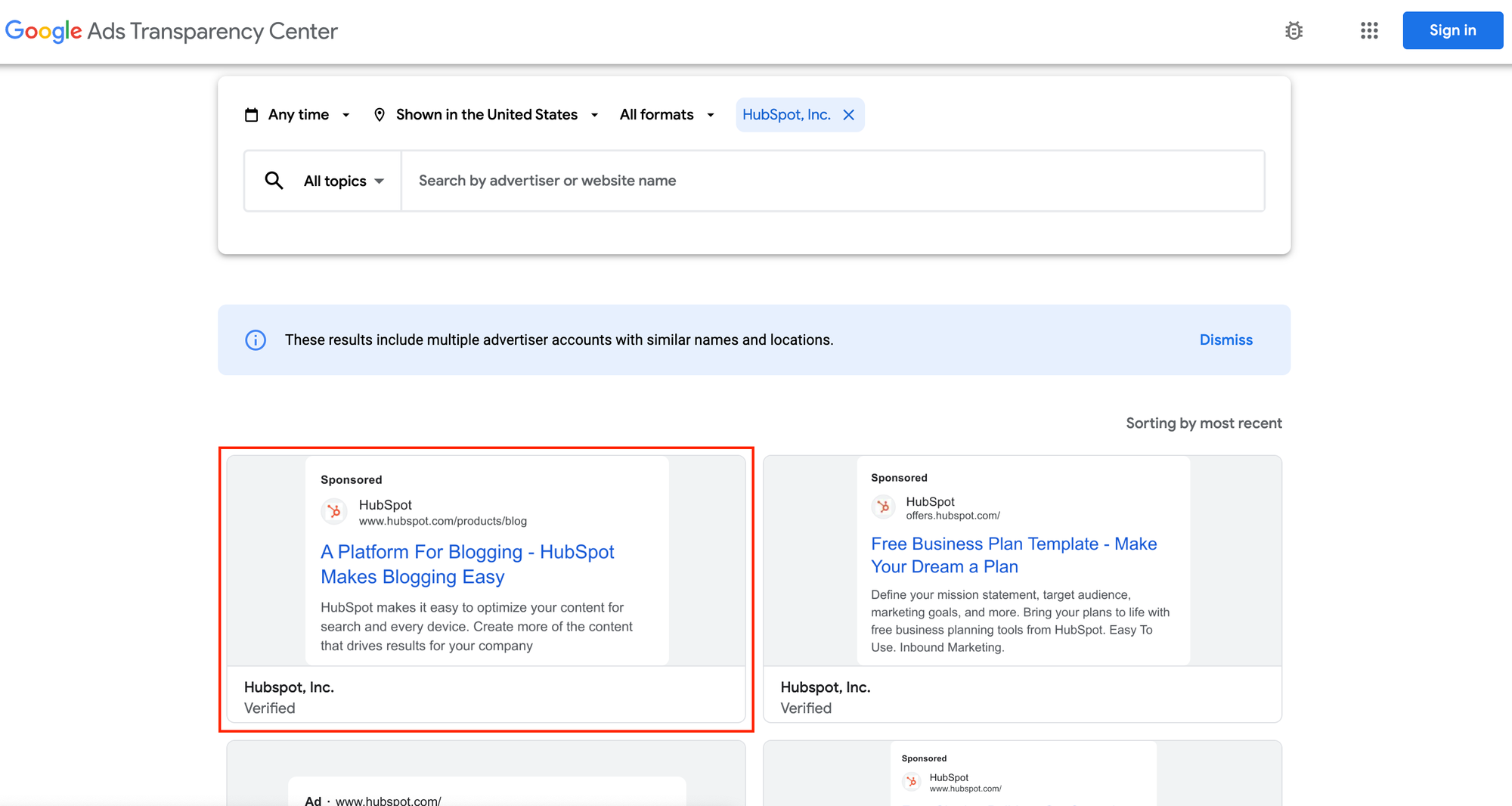 In the end, these are the results you will get. We are using Hubspot as an example. The image below shows the live ads from Hubspot.
