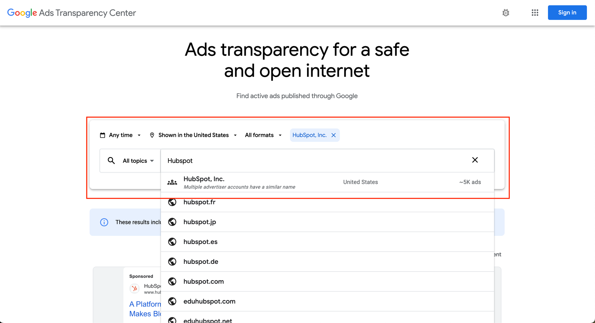 We will start from the Google Ads Transparency Center home page. Type in the company name you would like to monitor, in this example, we use Hubspot. Then click on the first relevant result in the dropdown menu.