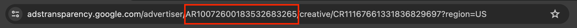 Switch your focus to the URL bar and notice the series of characters that starts with AR, that is the Advertiser ID of the company. Hubspot's Advertiser ID is AR10072600183532683265.