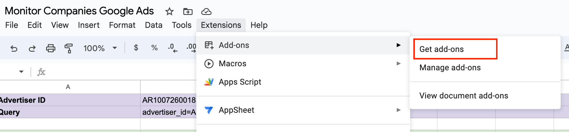 Let's install the SerpApi's add-ons. At the menu bar, you should see Extensions, find the Get add-ons option within it.