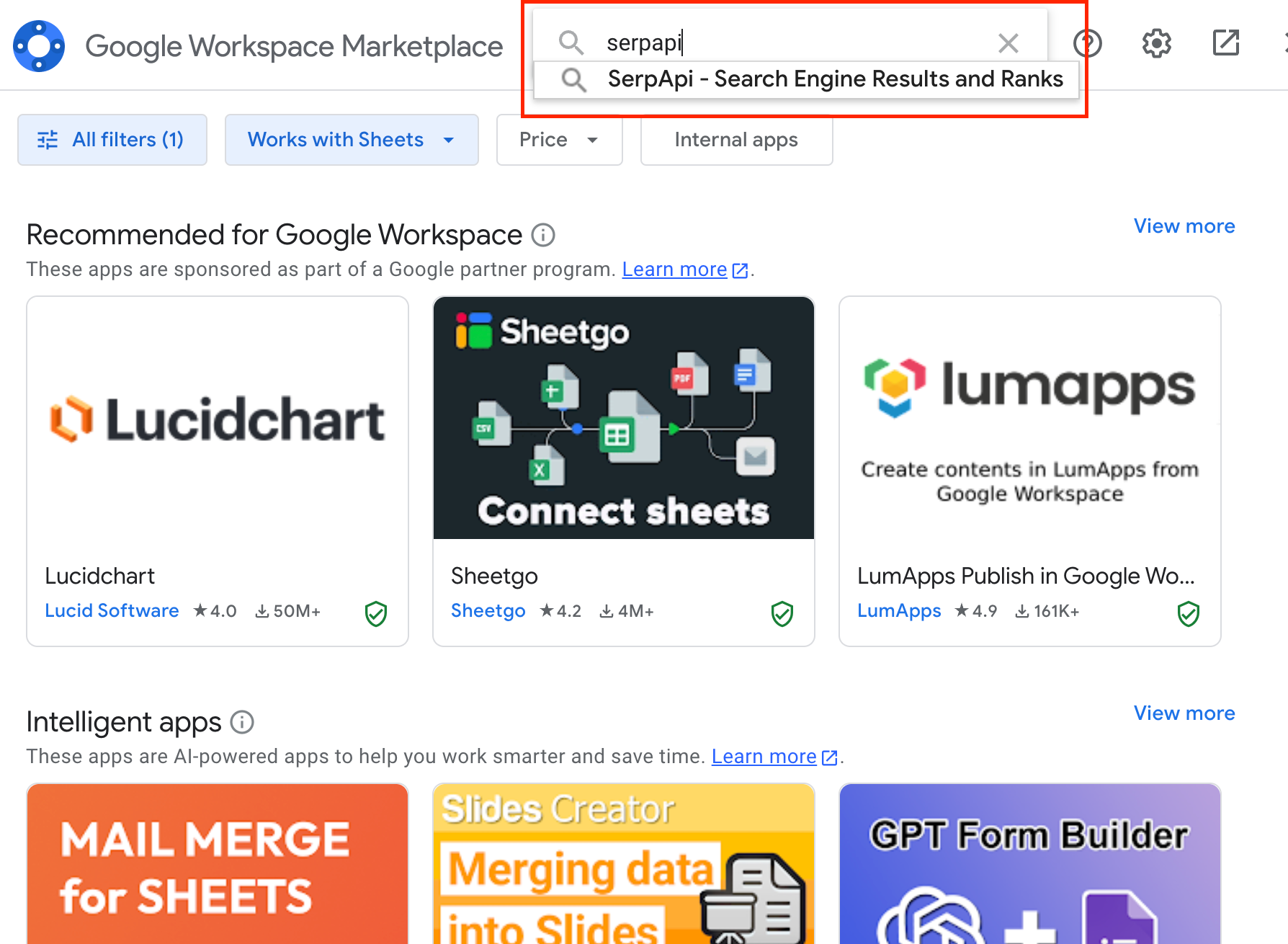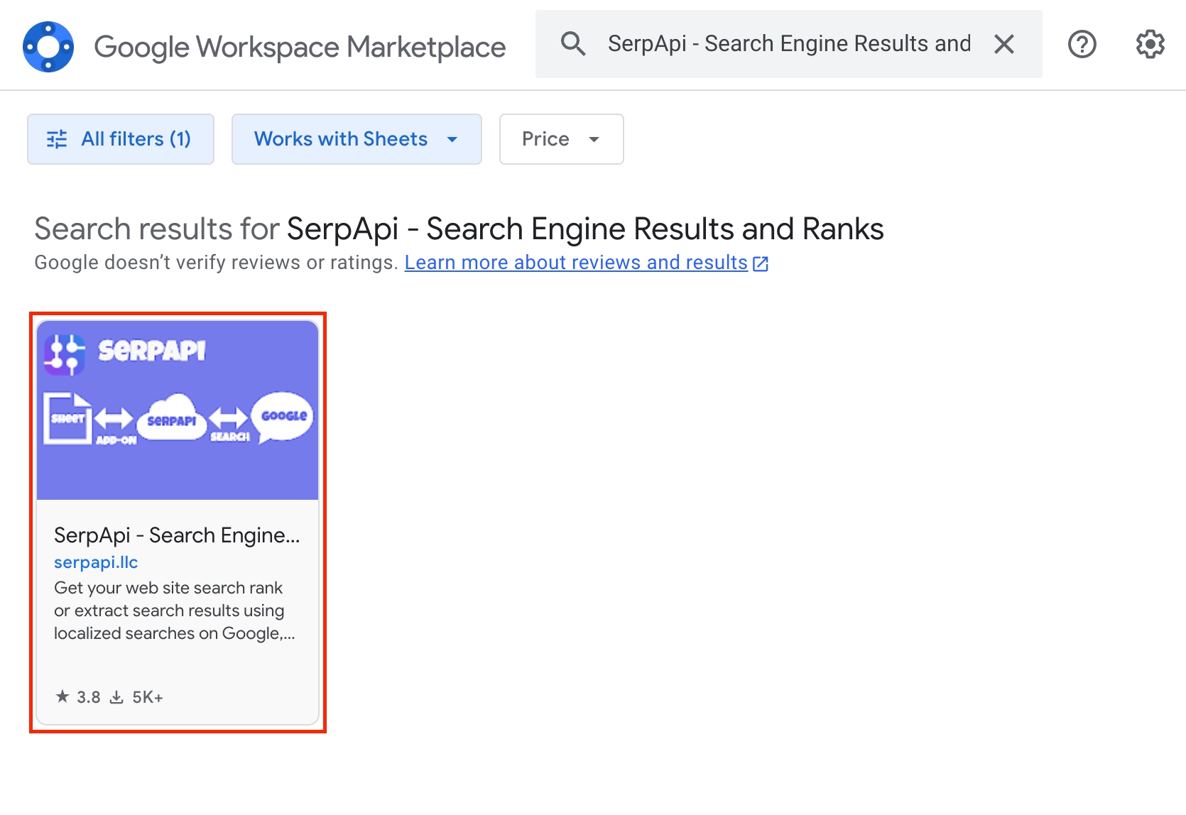 Google Workspace Marketplace will show up after you click on it. At the search bar, type in serpapi, and click on the first result like the image below.