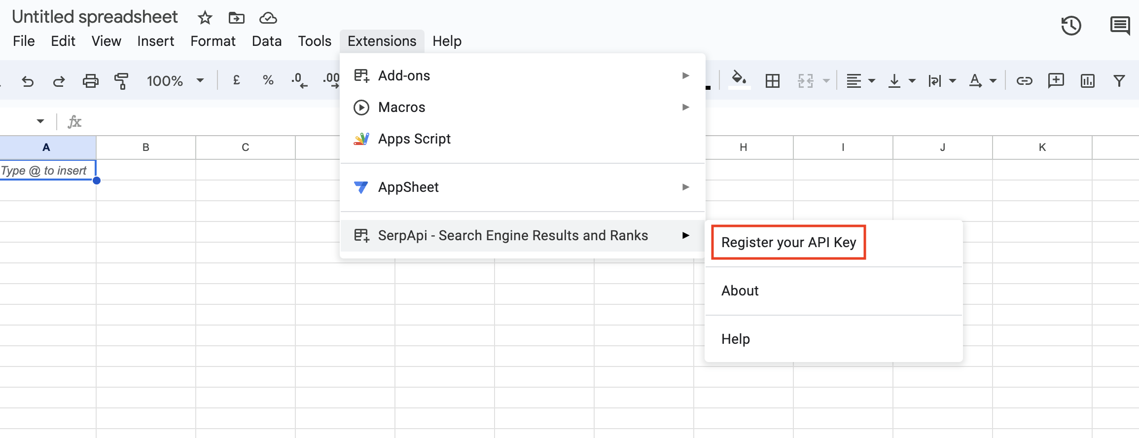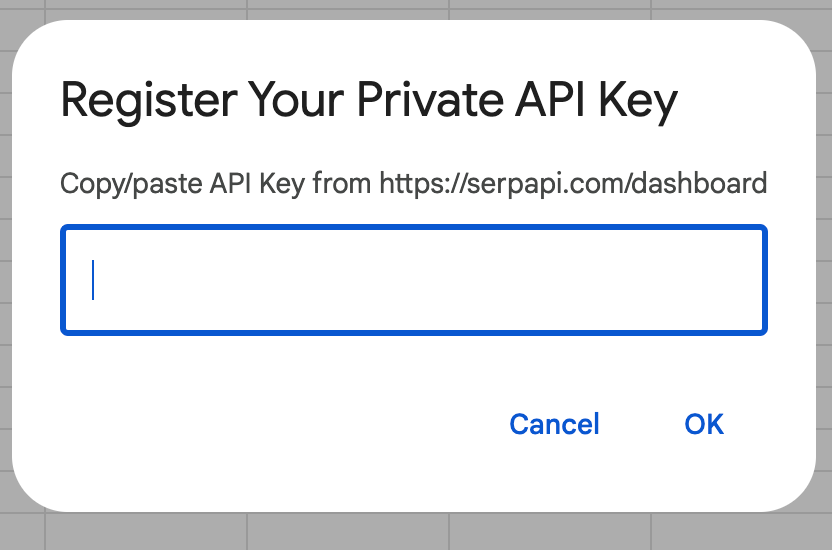 Once you successfully sign up with SerpApi, you can find the API key in the dashboard. Copy the API key and in Google Sheets, find Register your API key within Extensions.
