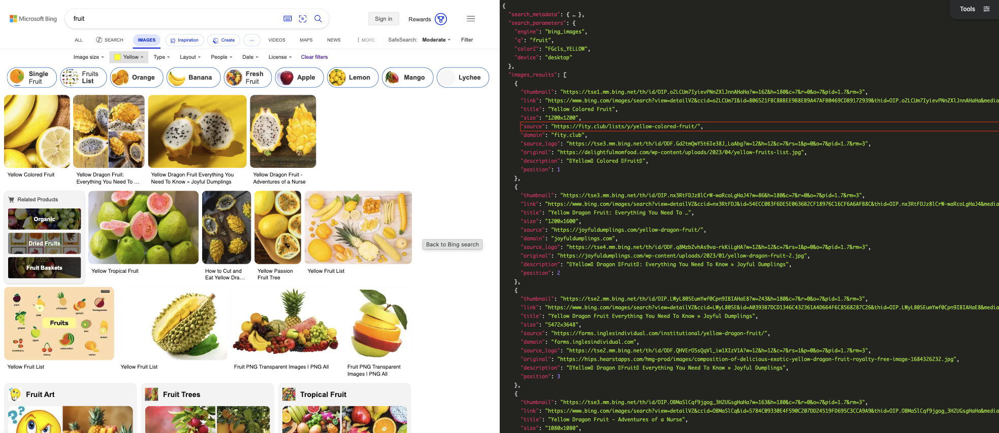 I'm going to cover the primary use case example in this section for the sake of brevity; if you were relying on portions of the response not directly related to the image results such as suggested searches, refined searches, or related searches, you can browse through our Bing Images API documentation to see how it differs.
