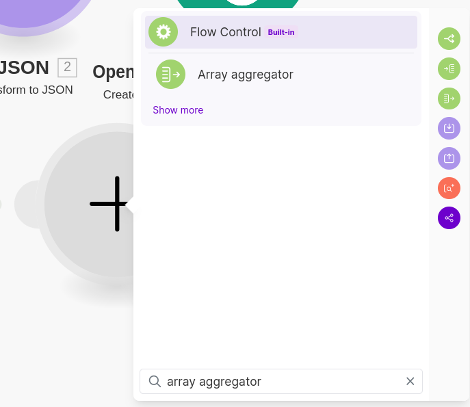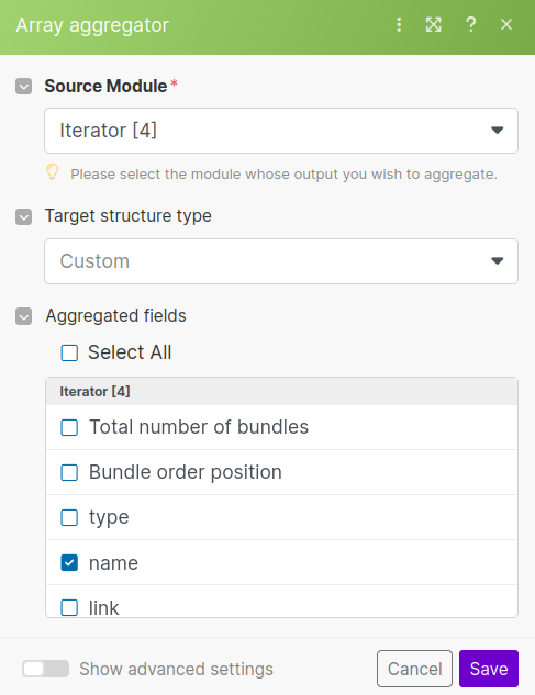 After the Iterator, add the Array Aggregator Module. This Module will help us select the fields we want from each element of the Properties array and organize them into a new array.
