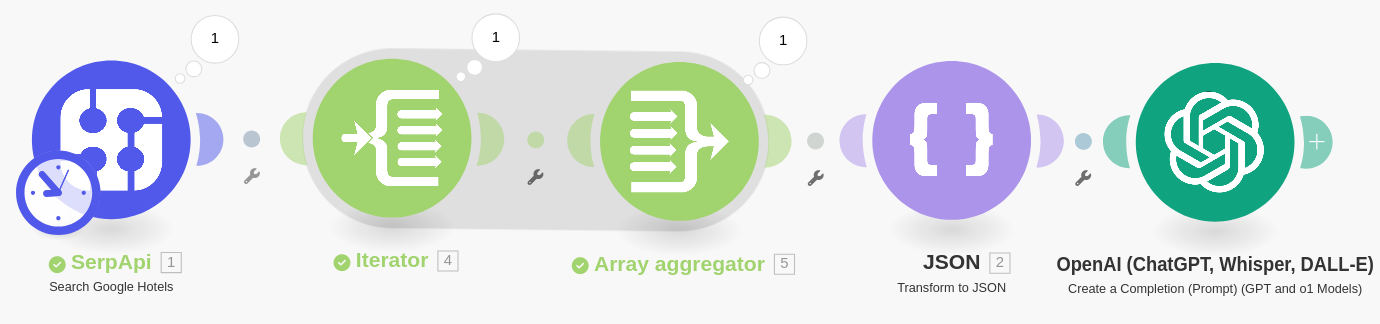 Now re-connect the JSON and OpenAI Modules to run after the Array Aggregator. The Scenario should look like below.