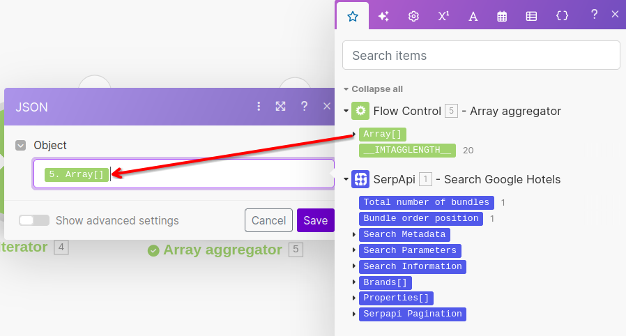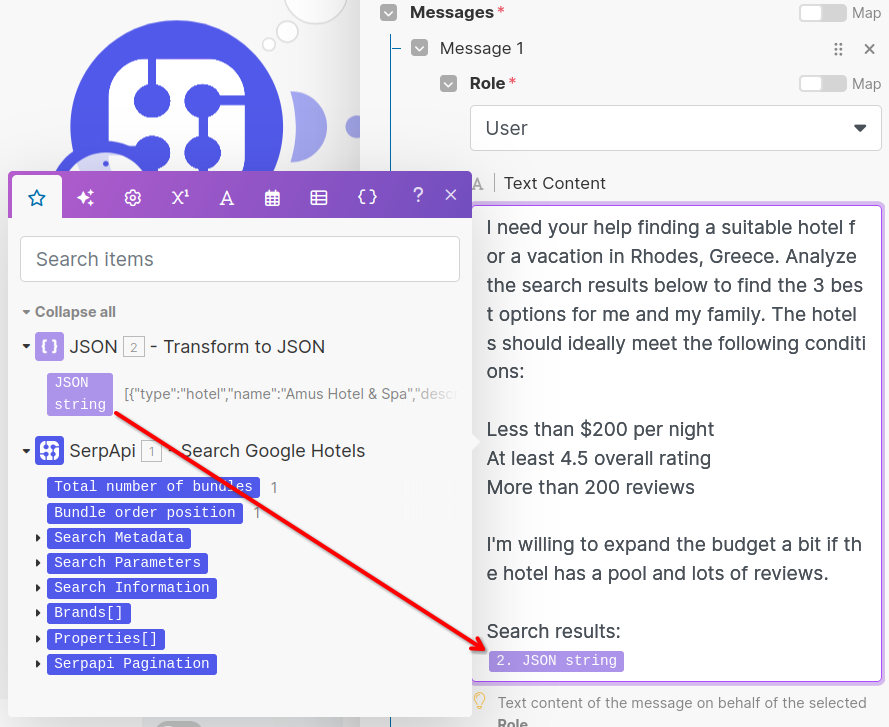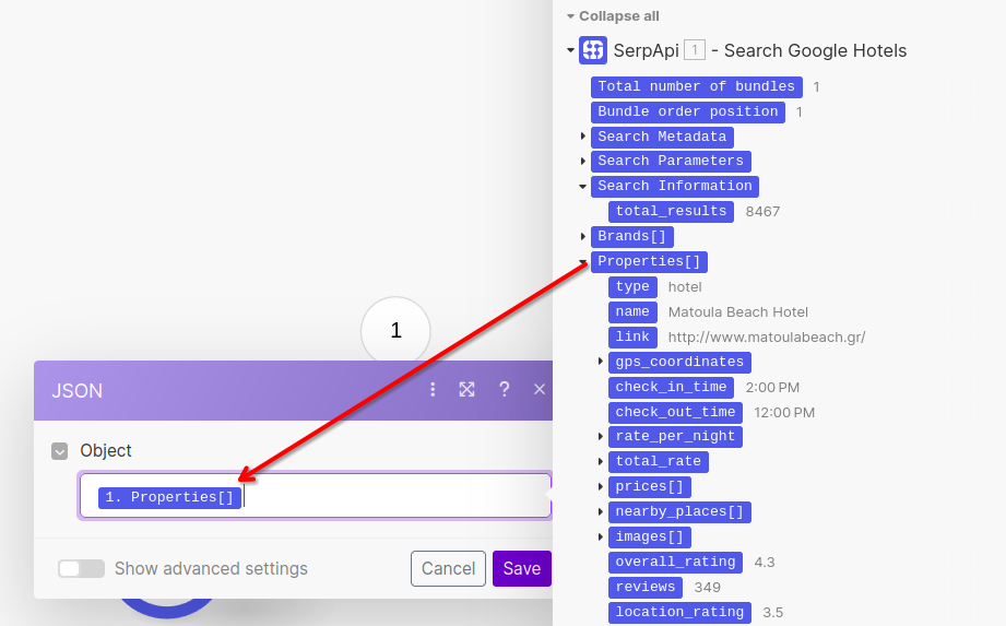We'll include our hotel results JSON by selecting the JSON String output from the JSON Module.