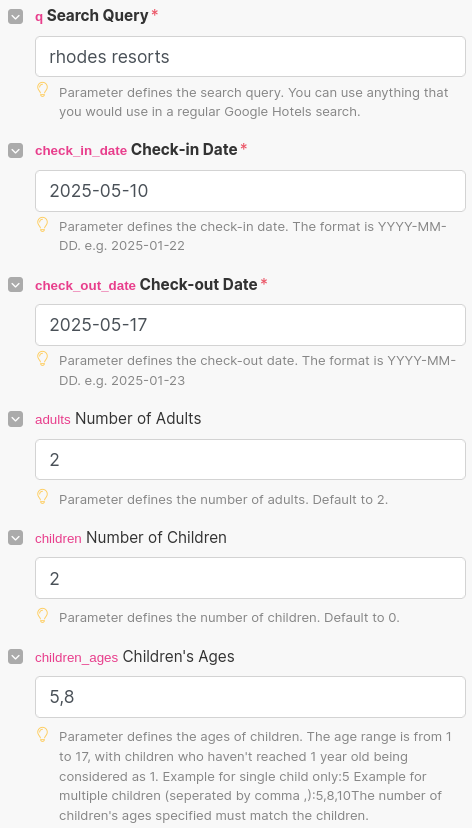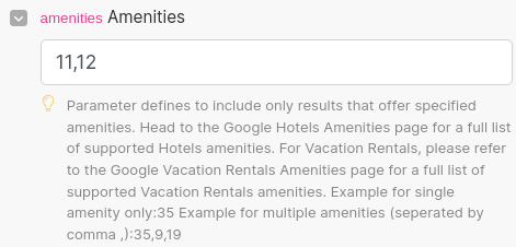 I also want to filter the search for child-friendly hotels with beach access. The amenities param takes in a list of comma-separated IDs mapping to various amenities. You can see that list here: https://serpapi.com/google-hotels-amenities.