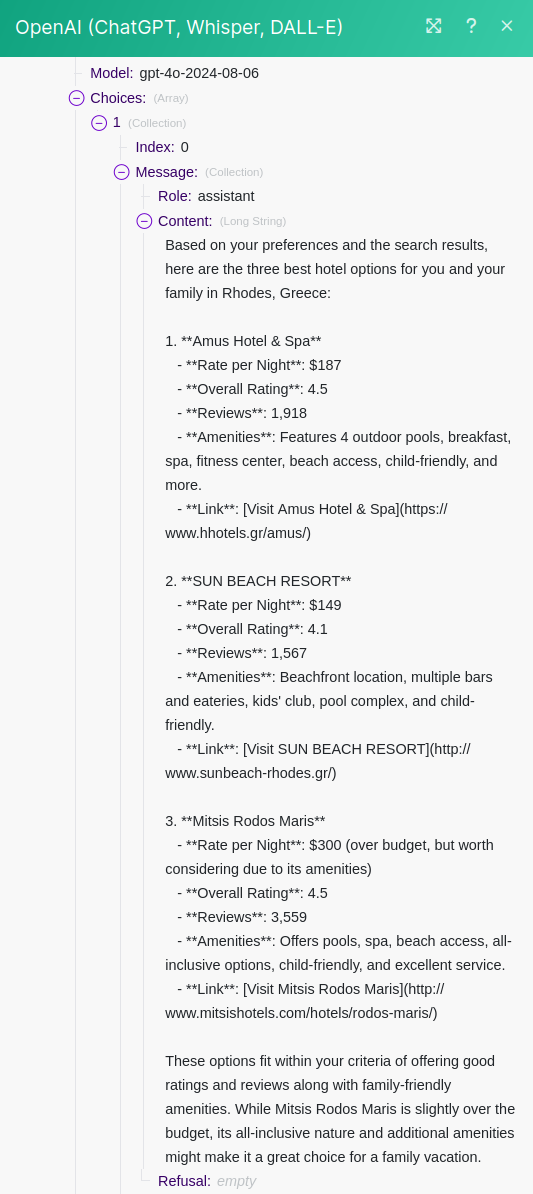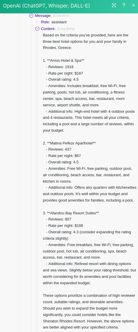 This obviously happens with AI tools sometimes. We can use this as an opportunity to learn how to add a filter to our Scenario to ensure ChatGPT doesn't see hotels that are way over budget.