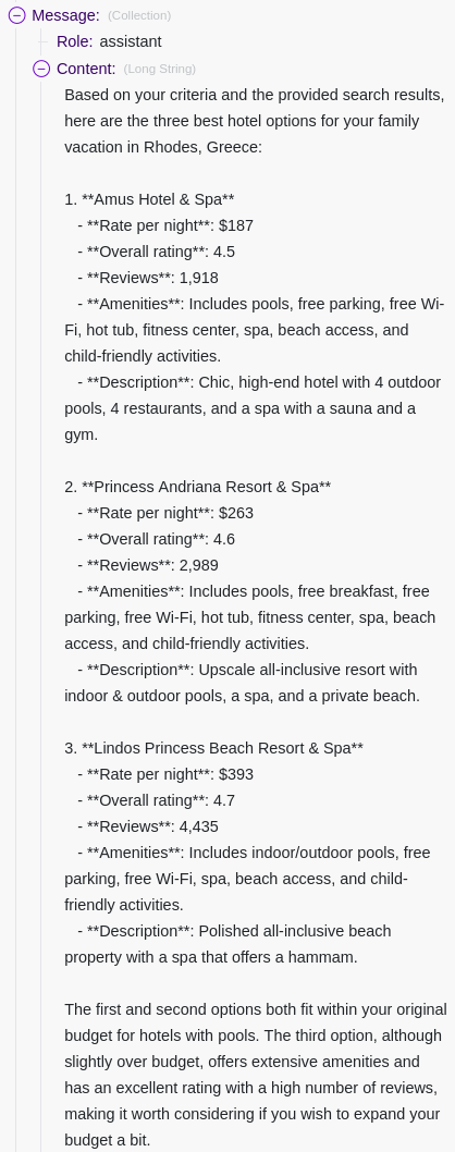 I think this is a good place to leave it. If I were to keep optimizing this, I would focus on writing a better prompt, tweaking more of the filters on the Google Hotels API call, and setting a price floor to filter out hotels too cheap. I might also add pagination to have even more hotels for ChatGPT to pick from.