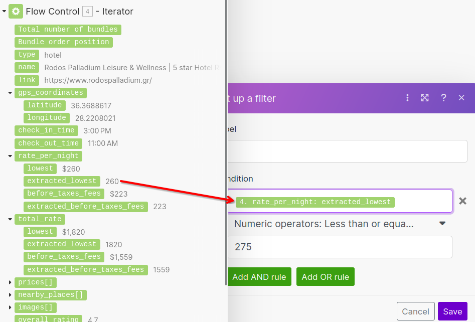 We don't want any hotels costing more than $275 per night. We'll create the filter using the rate_per_night: extracted lowest field and ensure it is less than or equal to 275.