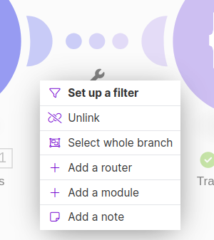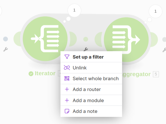 Click on the wrench icon between the Iterator and Array Aggregator Modules to open the menu. Click "Set up a filter".