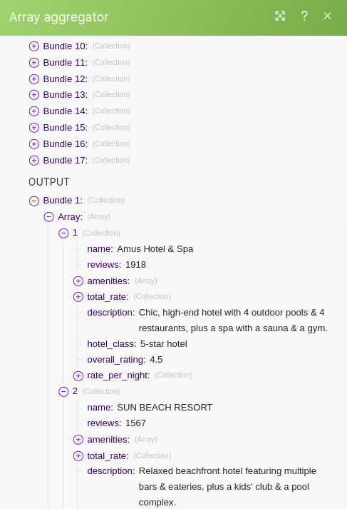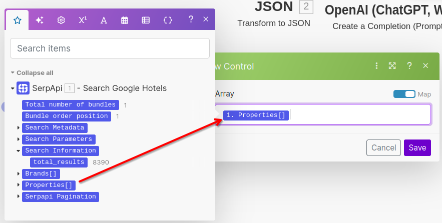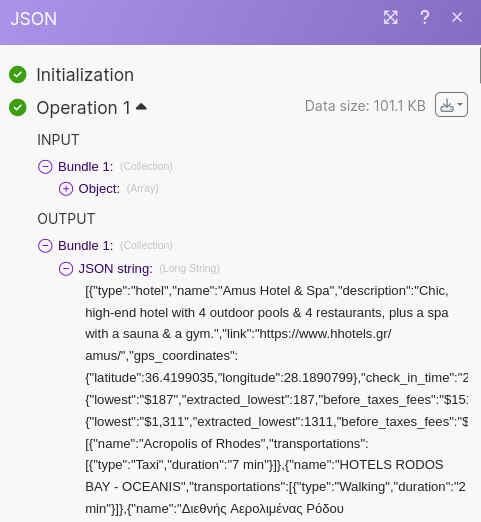 Before we can move on, we need to quickly transform the output data. Make's Output Collections are not understandable to ChatGPT so we need to transform the data into JSON.
