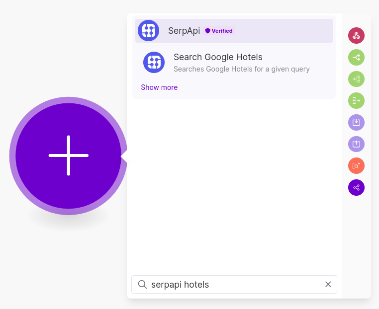 We'll create a new Scenario in Make and start with the Search Google Hotels Module from the SerpApi App.
