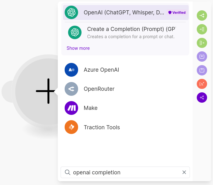 Coming back to Make, we'll search for "openai completion" to add the Create a Completion Module within the OpenAI App.