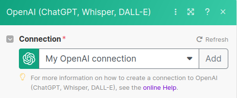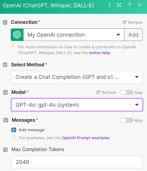 Once our Connection is configured, we can set up a request to ChatGPT. The default Method selected should be a "Create a Chat Completion". Leave that as is.