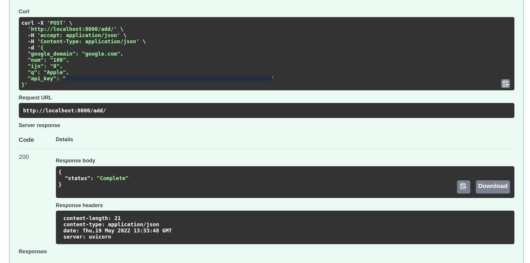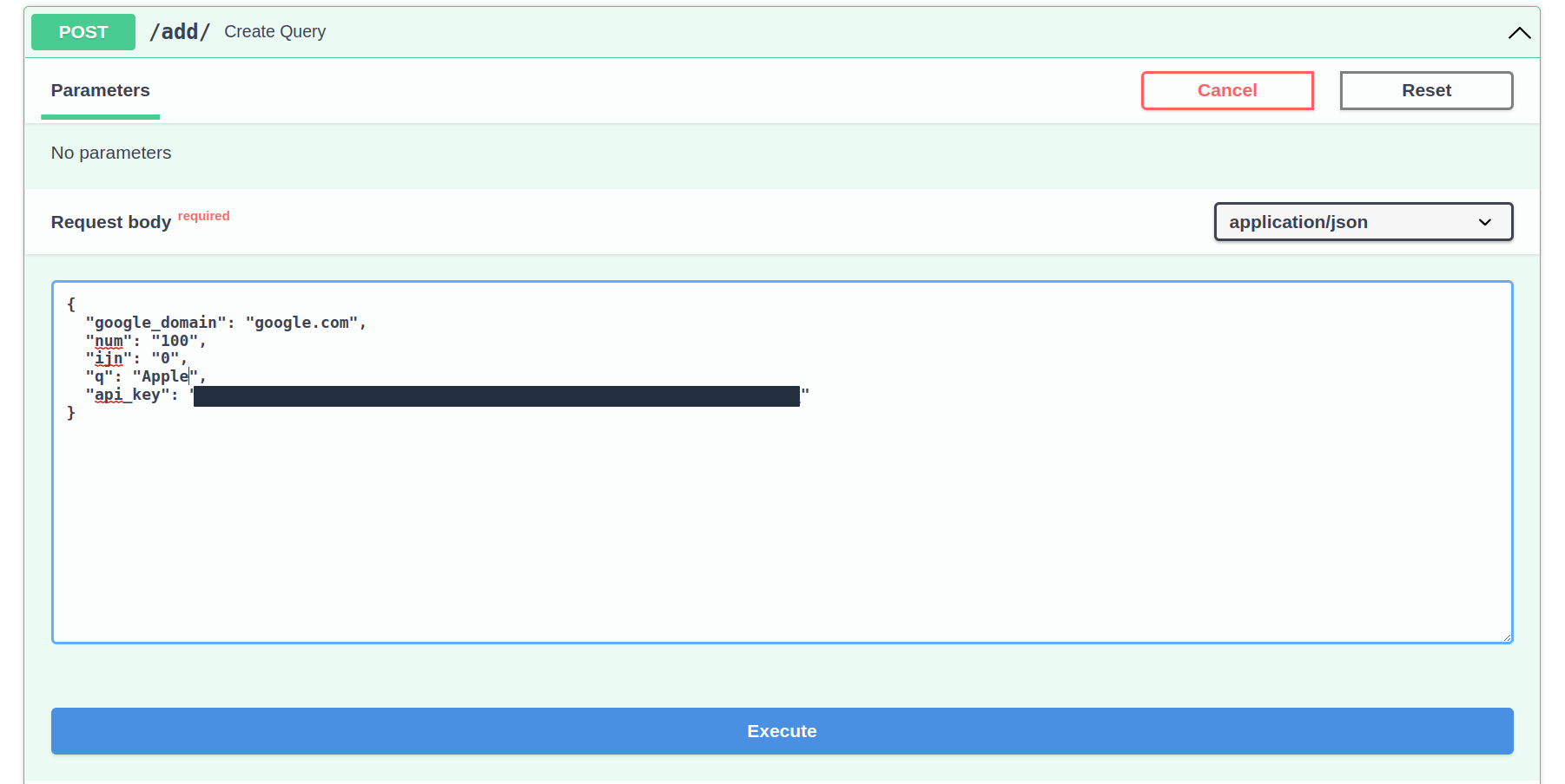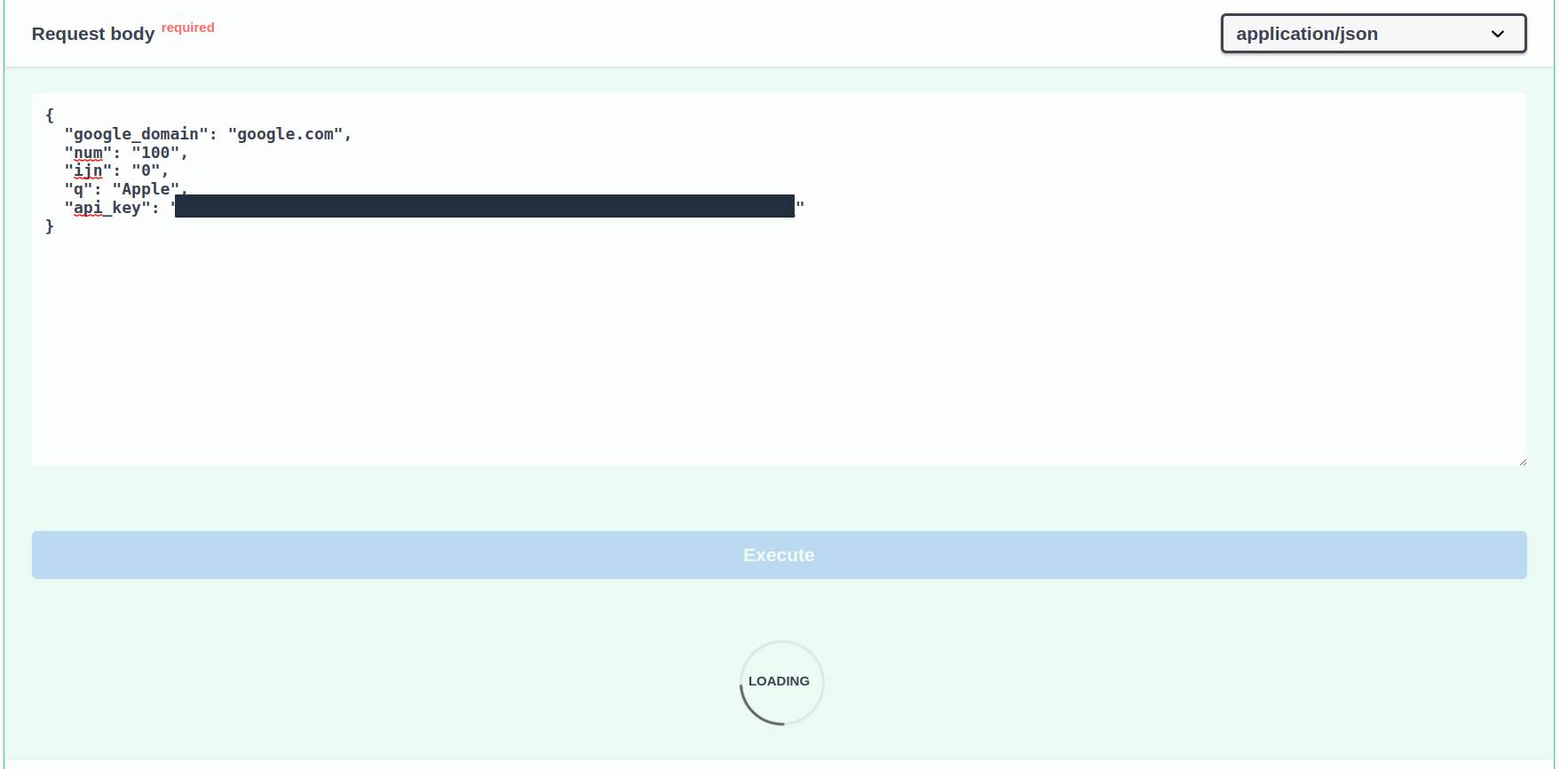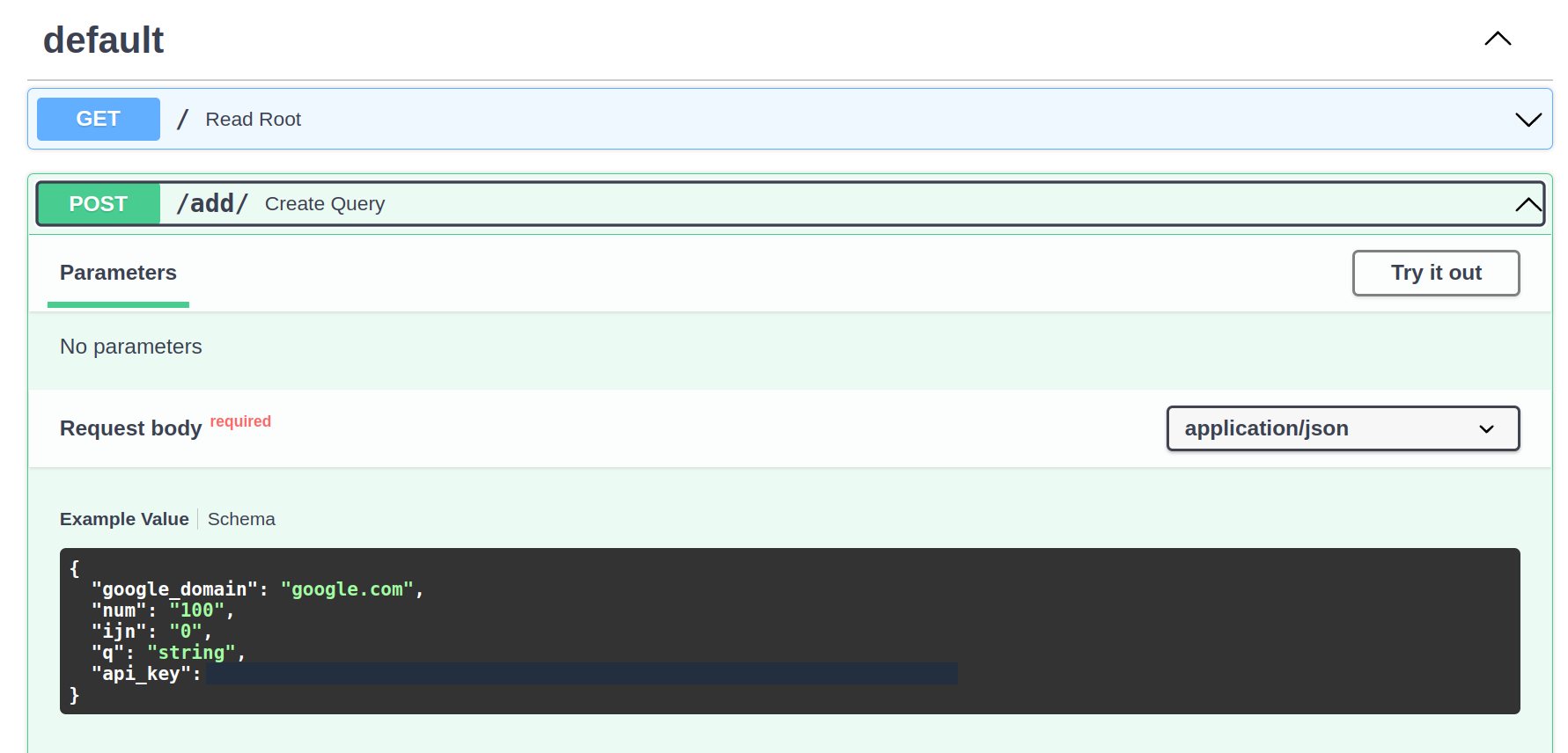 In this Pydantic model, q, and api_key parameters must be given. However as I stated in the comment, you can hardcode your api_key with the given method, so that you won't have to enter it at each attempt. The api_key in question refers to the SerpApi API key. You can register to a free or paid account via our register link here. Your unique API key can be found in the Manage API Key page.