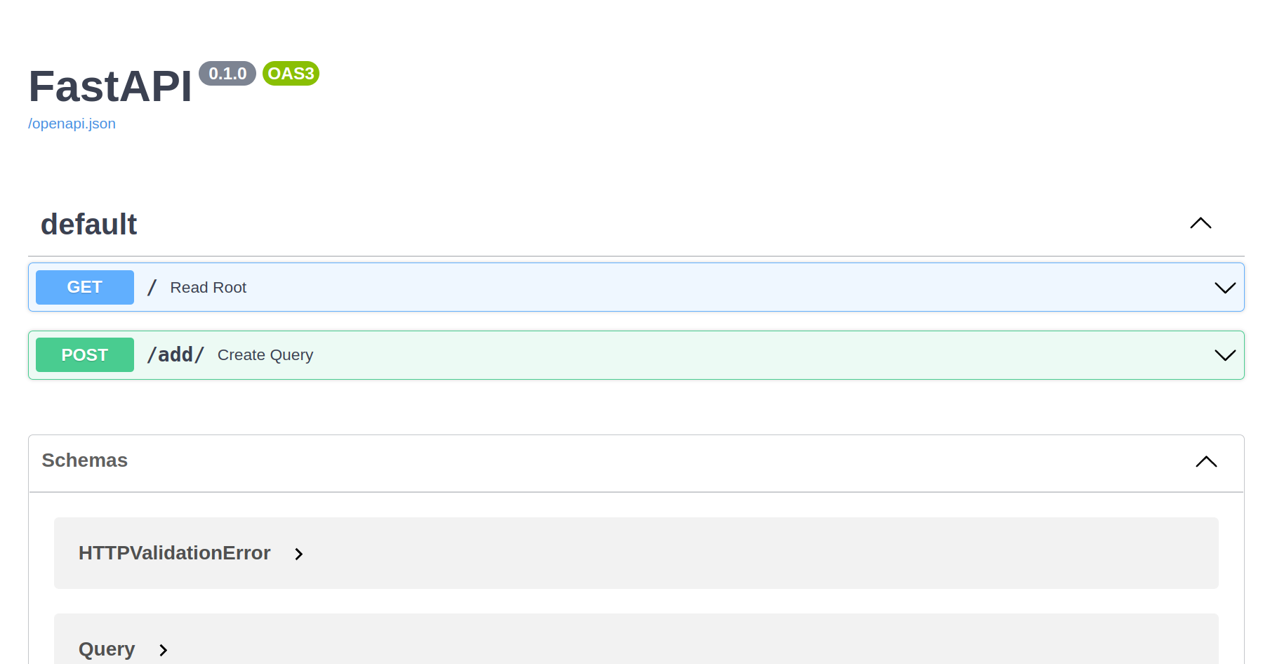 FastApi allows for automatic documentation and playground for the app. This is useful for us to test our endpoints manually. This is useful for us to manually create a post request to the add endpoint. Simply click on the button with Create Query: