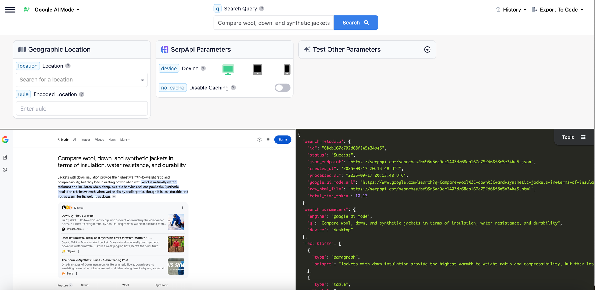 For example, let's try searching the Google AI Mode API for "Compare wool, down, and synthetic jackets in terms of insulation, water resistance, and durability". To do that, we just need to set our query as the value of the q parameter: