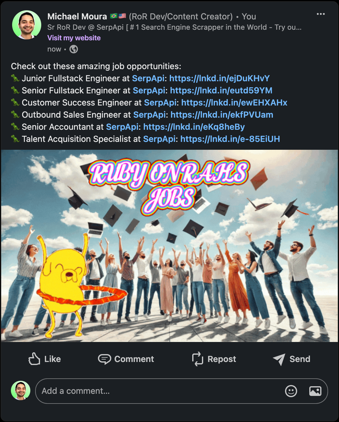 By using the job-post-maker-using-serpapi repository script, we can easily leverage the power of SerpApi to help us create amazing job board posts in less than 3 minutes, allowing us to create consistent value without taking much of our time.